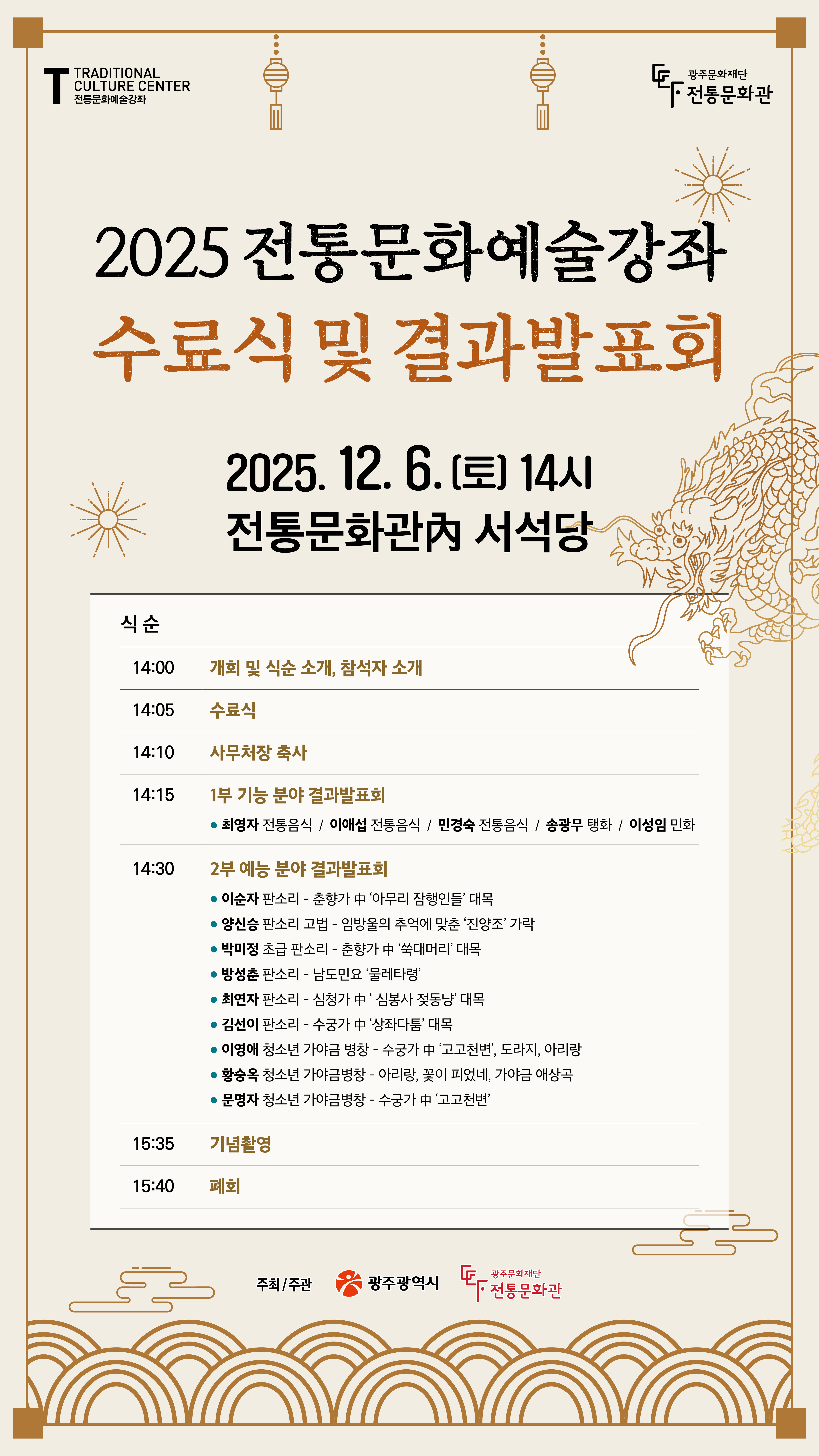 안내 2025 전통문화예술강좌 수료식 및 결과발표회 등록일2025.12.02 조회수121 댓글 0댓글쓰기 댓글목록 등록된 댓글이 없습니다. 이전글 이전 글이 없습니다. 다음글 희경루 풍류소리 8회차 공연 안내 목록